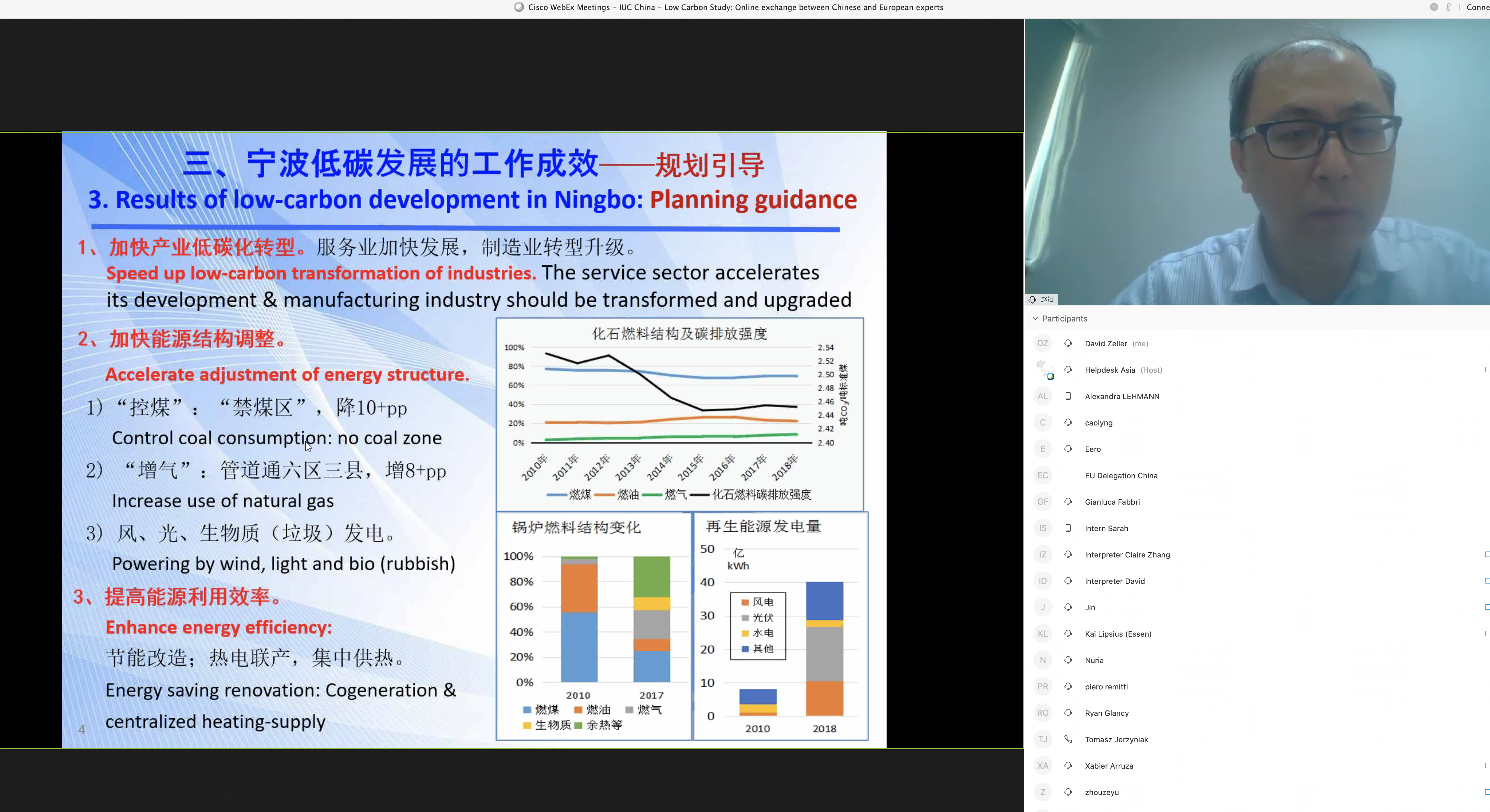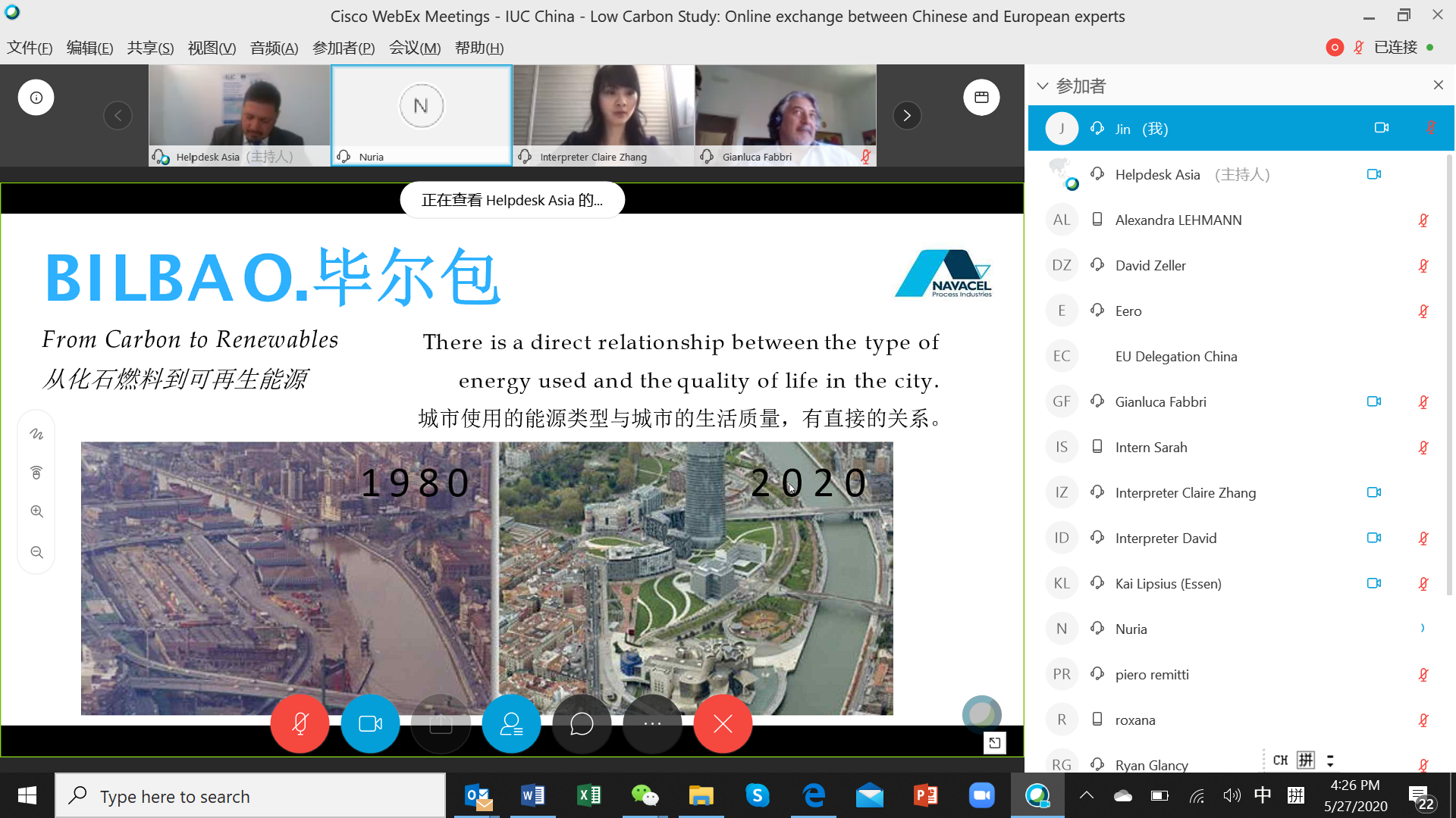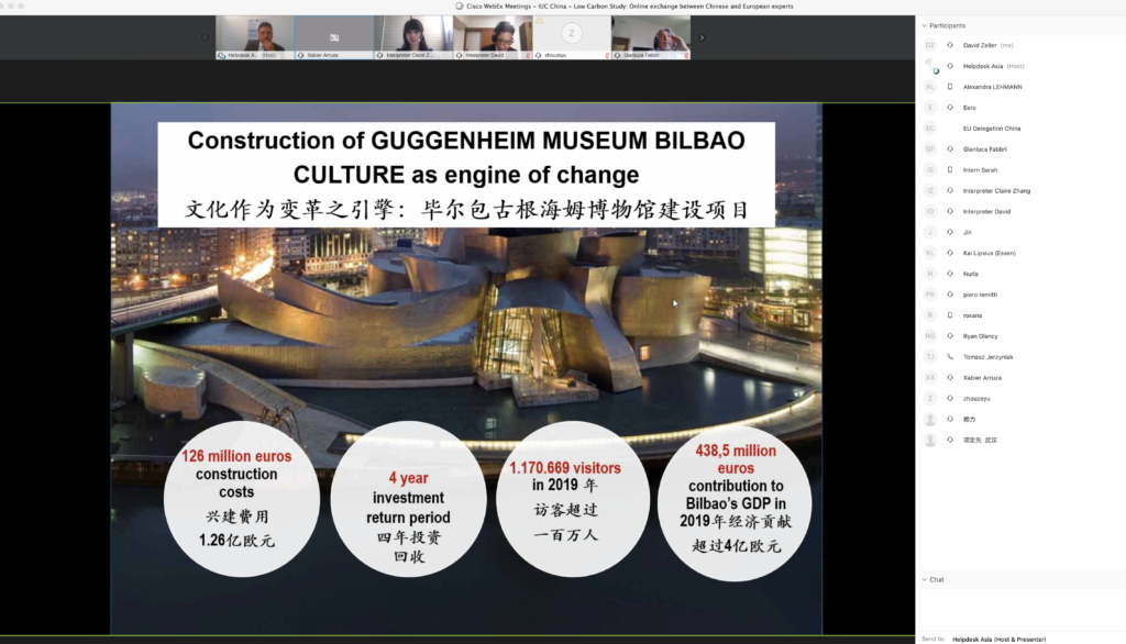 Case studies were presented on today’s call by the European cities of Bilbao (Spain) and Essen (Germany), and Chinese cities of Wuhan, Ningbo and Jiangsu Province. Experts explained challenges and achievements in the last decades of the cities’ transformation towards low-carbon. In general, they said that it’s the cities the ones who go ahead of the national governments, both in China and Europe.