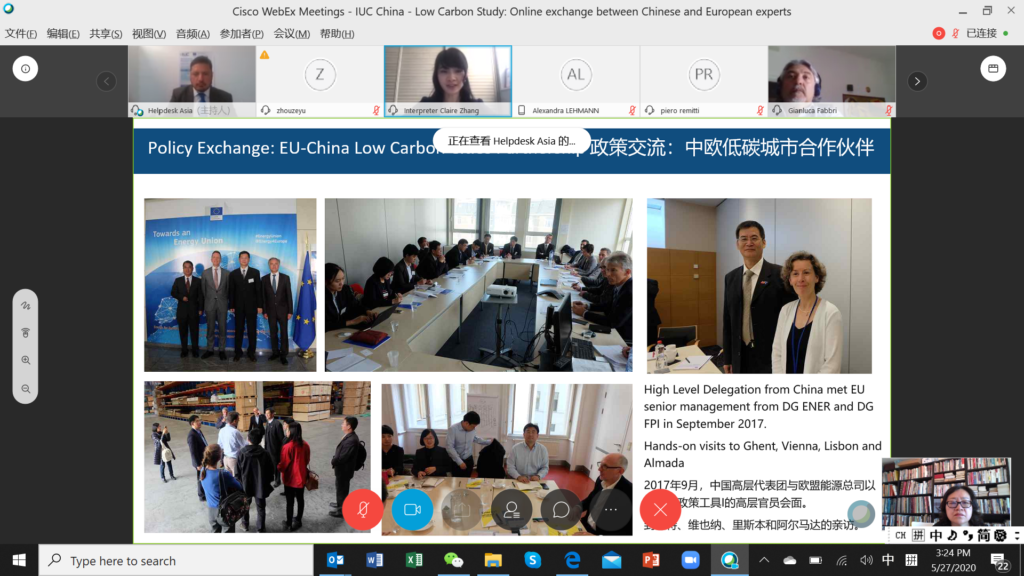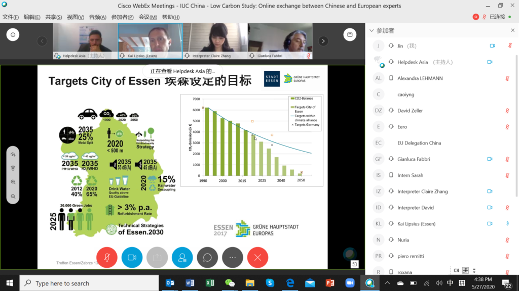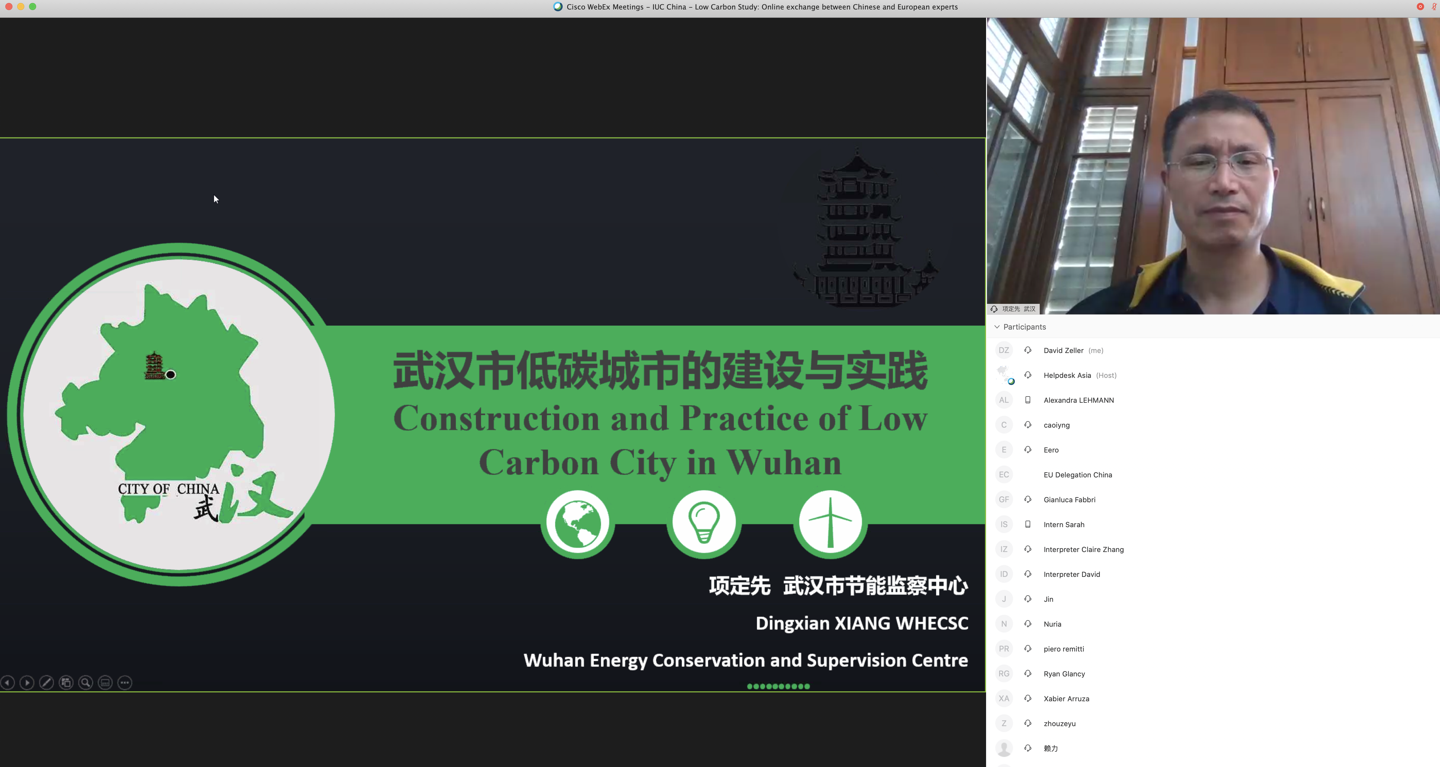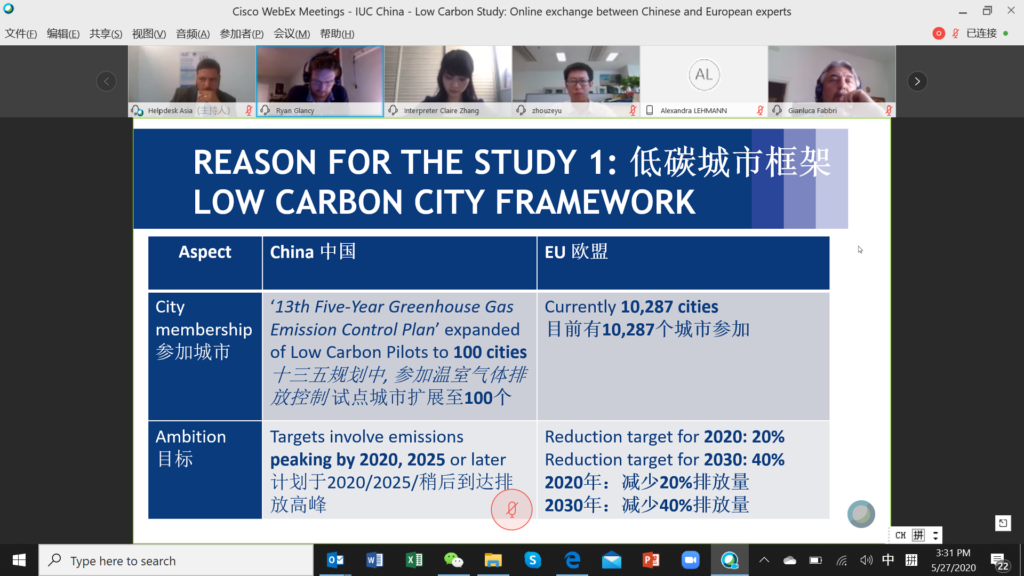 The IUC-Asia programme held an online session today to present its progress on the ongoing EU-China Low Carbon City Study, along with case studies of several cities. On the call were senior experts from both China and Europe. The study is being jointly drafted by the IUC-Asia project and experts of China’s National Center for Climate Change Strategy and International Cooperation (NCSC). Today’s online session was a stepping stone to the onsite conference foreseen for September 2020 in China (TBC).