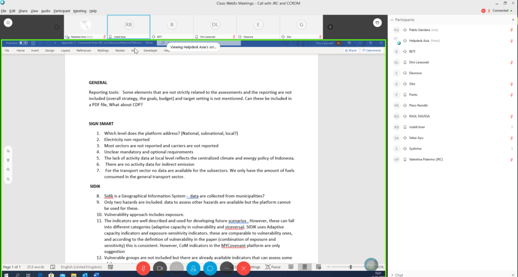 The IUC team organised a coordination meeting among the European Union’s Joint Research Center (JRC) and IUC’s technical partner CCROM (Centre for Climate Risk and Opportunity Management) to discuss the integration of Indonesia’s climate reporting platforms (SIGN SMART – SIDIK) into the Global Covenant of Mayors’ Common Reporting Framework (CRF).
