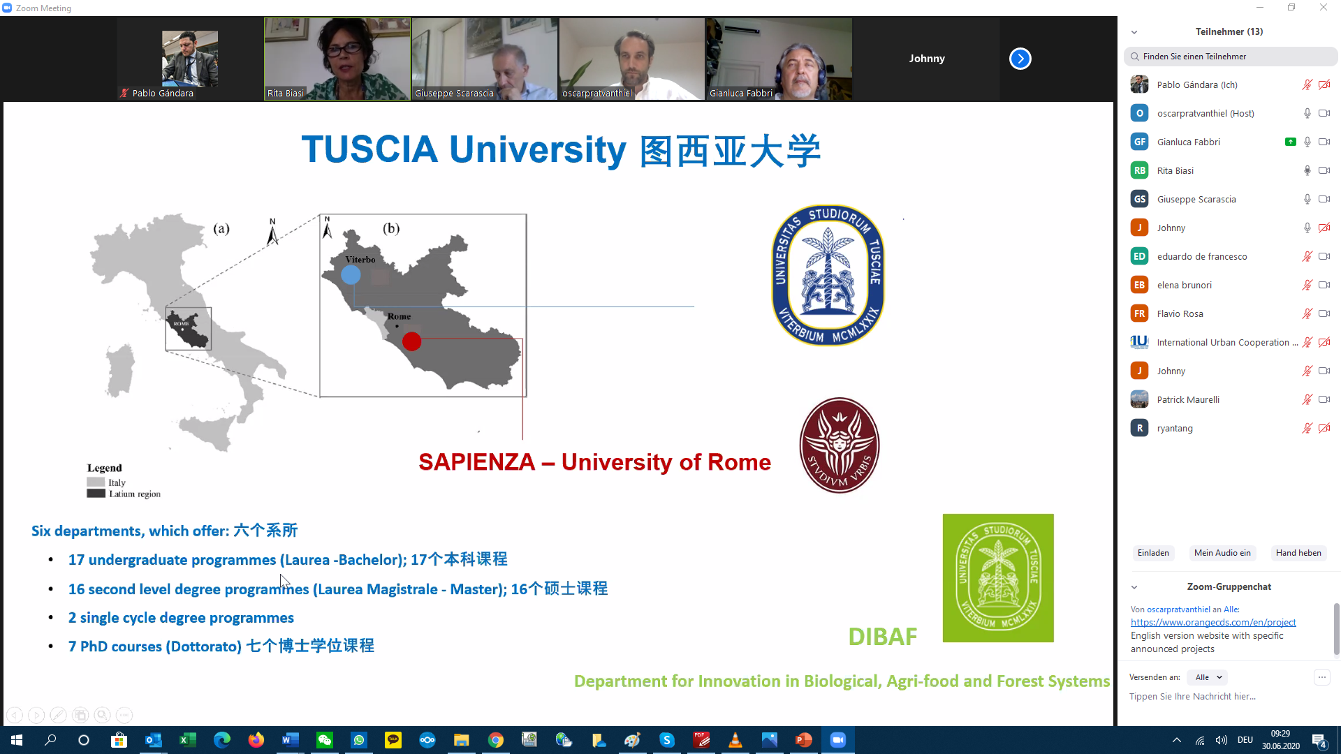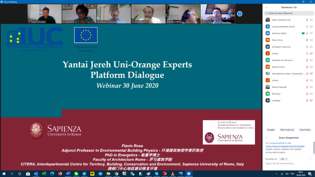 Within the education and smart city clusters, an online exchange session was held today between 13 experts from the IUC, Yantai and Rome, including Yantai University and the universities Sapienza and Tuscia of Rome. In order to complement the university cooperation, the partners involved the Smart City Lab of Rome/Lazio and the innovation center of Yantai Jereh Uni-Orange. The purpose of the meeting was to discuss the cooperation roadmap drafted by the IUC team.