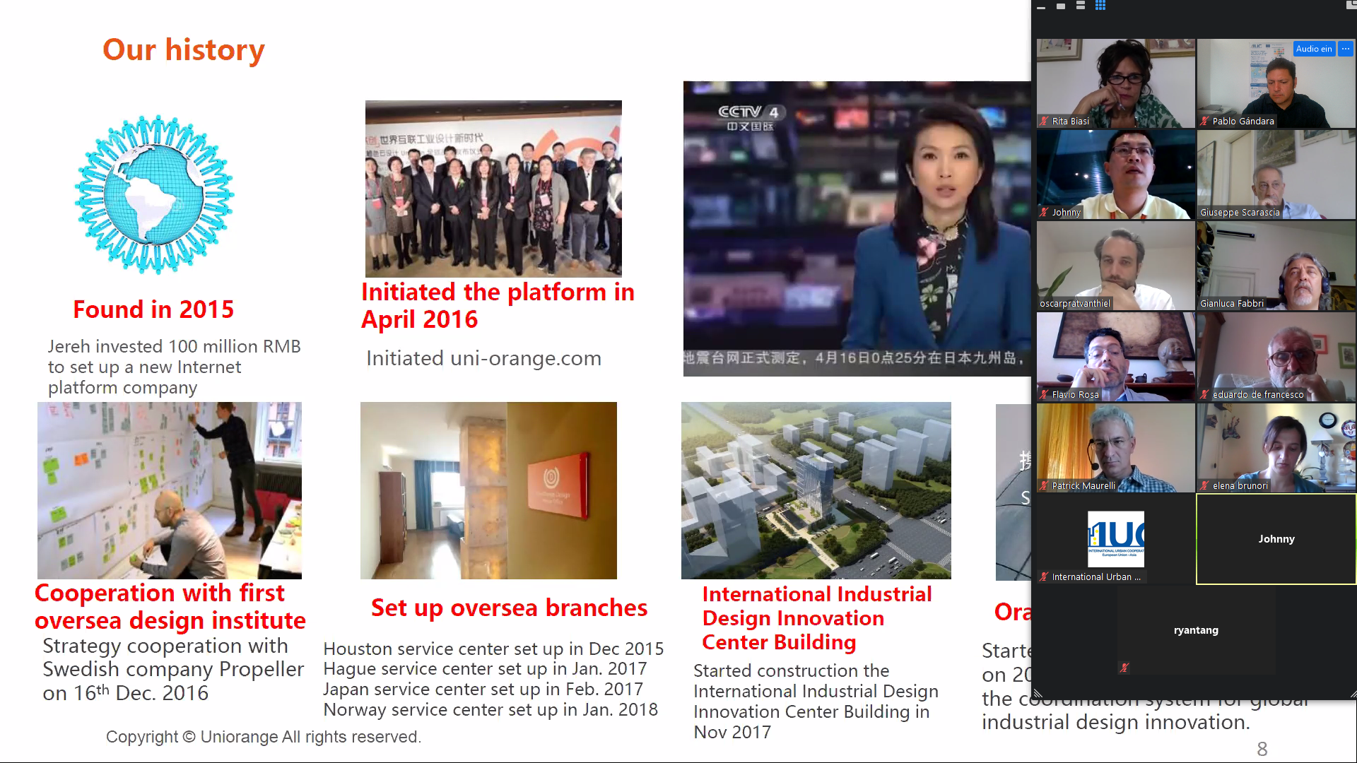 Professor Johnny Zhang from Yantai Jereh Uni-Orange introduced a platform for open innovation and collective collaboration, to solve the difficulties of R&D design. Uni-Orange centralises and publicises specific engineering projects requests by academia, Government and Chinese private enterprises in order to provide an opportunity for international experts to participate by providing solutions. His colleague Ryan Tang from the Yantai Jereh Uni-Orange introduced few projects under implementation.