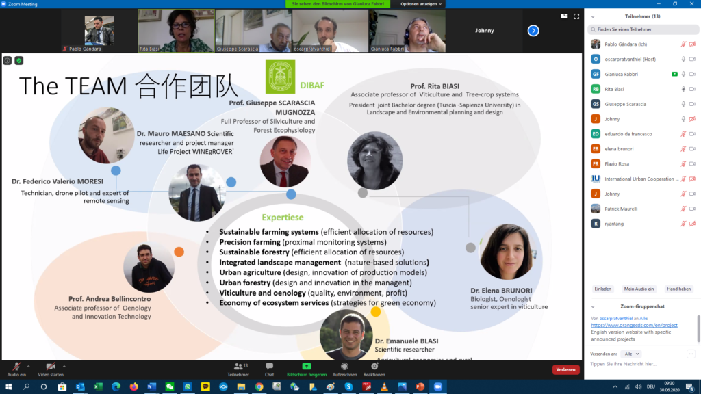 After a brief introduction by the IUC team, Professors Rita Biasi and Giuseppe Scarascia Mugnozza from Tuscia University introduced the Department for Innovation in Biological, Agri-food, and Forest Systems of Tuscia University. They addressed the rising interest of integrating green / nature-based solutions into the urban development planning. Prof. Scarascia said that these topics have gained relevance during the Covid19 pandemic crisis, creating opportunities in areas like bio city, forest city, sustainable farming systems, and urban agriculture. He referred to ways to reorganise urban life by greening cities, being more efficient with the use of resources, and incorporating IoT solutions. He also highlighted Tuscia’s role in producing a Green Book on Biocities in an EU funded programme and proposed the development of a joint curriculum on green landscape and urban forestry with Yantai colleagues.