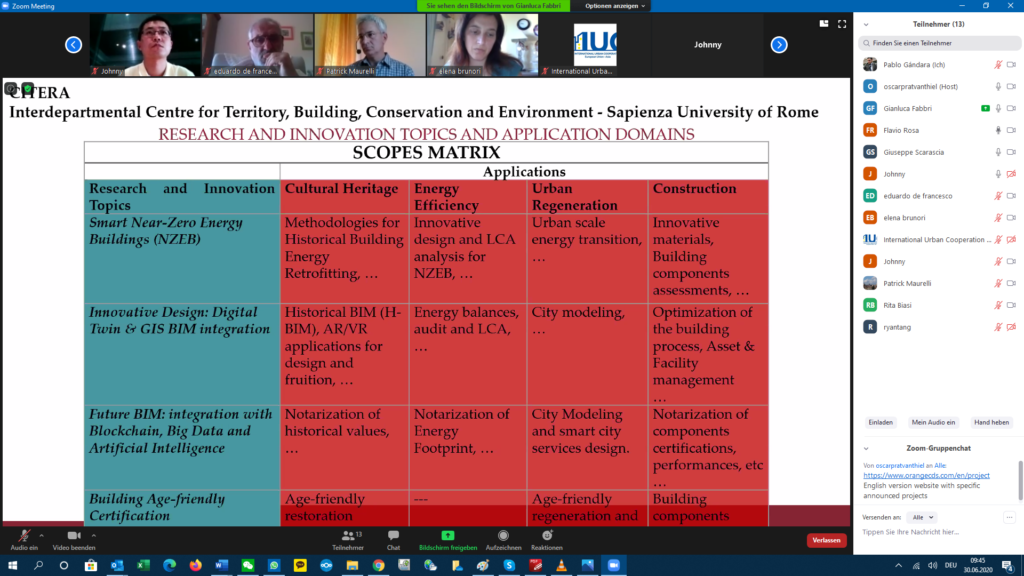 Professors Flavio Rosa and Patrick Maurelli from Sapienza’s CITERA (Interdepartmental Centre for Territory, Building, Conservation and Environment) introduced the research group of eight professors and researchers willing to cooperate with Yantai partners. They presented a matrix for CITERA’s research topics and their possible applications, including inter alia: