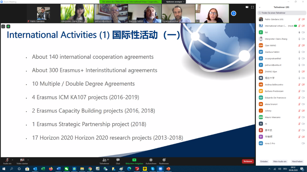Professor Felicetta Ripa introduced the international activities of Tuscia, including cooperation agreements in China with the Sichuan Provincial Institute of Natural Resource Science, the South China Botanical Garden, the Chinese Academy of Sciences and the Anhui Agricultural University. She proposed to support exchange with Yantai within existing programmes including the International Credit Mobility KA107 (mobility of University students, professors, researchers, administrative staff), capacity building projects between EU and Extra EU Universities, the Strategic Partnership programme and the upcoming Horizon Europe 2021-2017 programme.