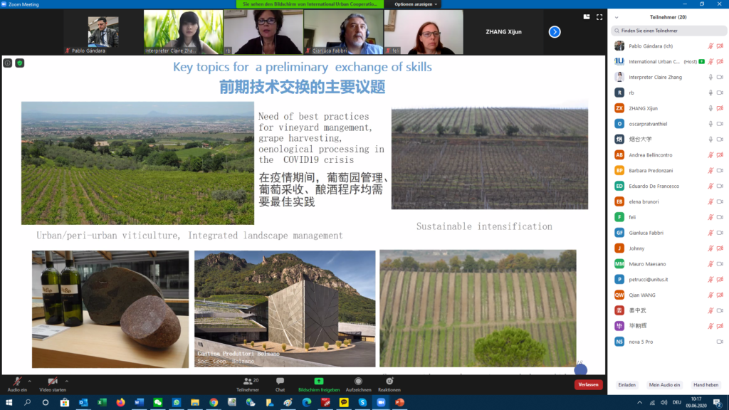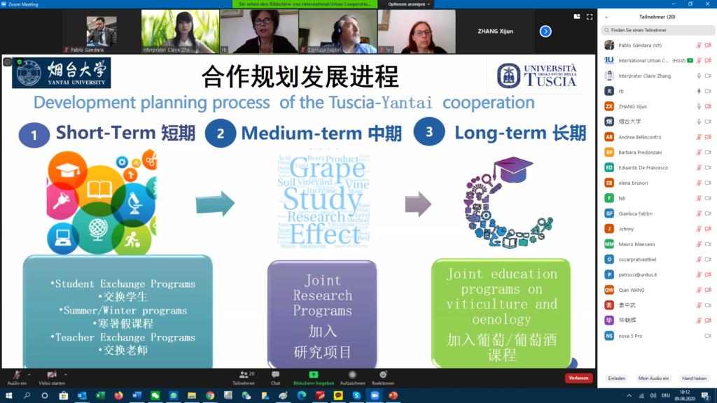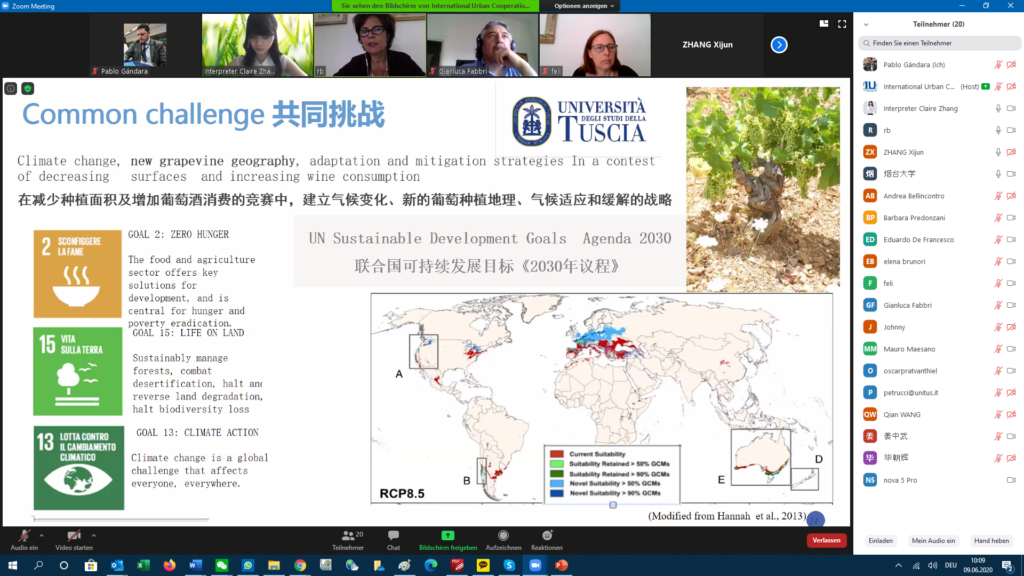 Professor Rita Biassi from the Department for Innovation in Biological, Agri-food and Forest Systems (DIBAF) at the University of Tuscia proposed to cooperate in urban/peri-urban viticulture and integrated landscape management as a way to maintain the competitiveness of the wine sector in light of ongoing environmental emergencies, e.g. land degradation. Peri-urban areas surrounding large cities like Rome and Yantai are crucial for sustainable regional development as they include transition zones. Professor Biassi stated that climate change is a challenge that makes the development of new grapevine geography necessary. Peri-urban areas in the Lazio region need to develop adaptation and mitigation strategies in a contest of decreasing surfaces and increasing wine consumption. Cooperation with China would support the sustainable development goals of the UN, specifically goal 2 (zero hunger), 11 (sustainable cities and communities), 13 (climate change), and 15 (life on land).