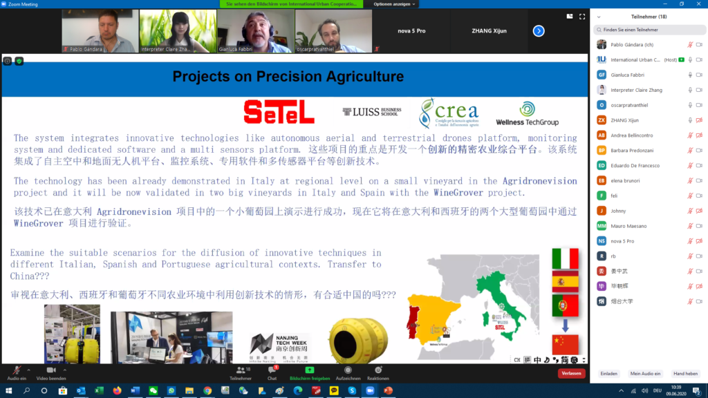 - Include Yantai into the existing EU Wine Grover project activities for Precision Agriculture, funded by the EU’s LIFE programme and involving Tuscia University. The project demonstrates how the application of advanced techniques in precision farming for viticulture, combined with the use of different drones and sensors, can have an important effect in terms of reducing greenhouse gases and soil protection. Partners agreed to involve the companies SETEL and Wellness TechGroup (both from Rome) and Changyu Winery (Yantai)
