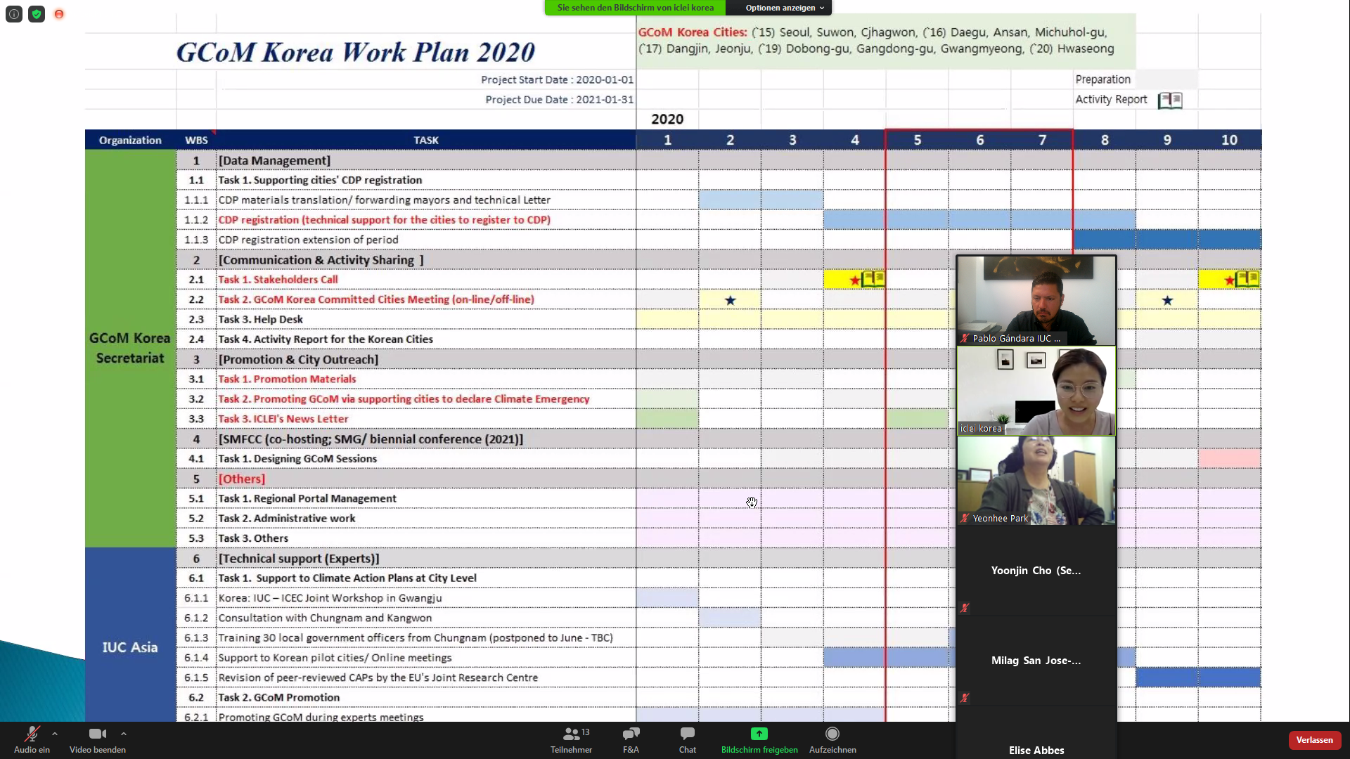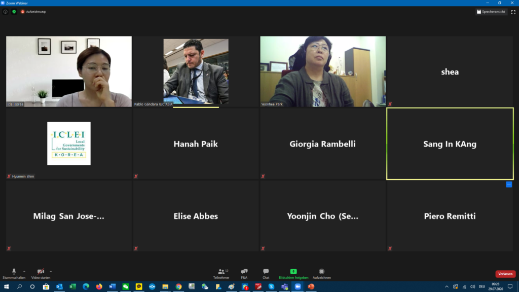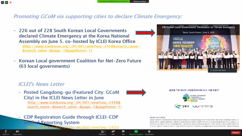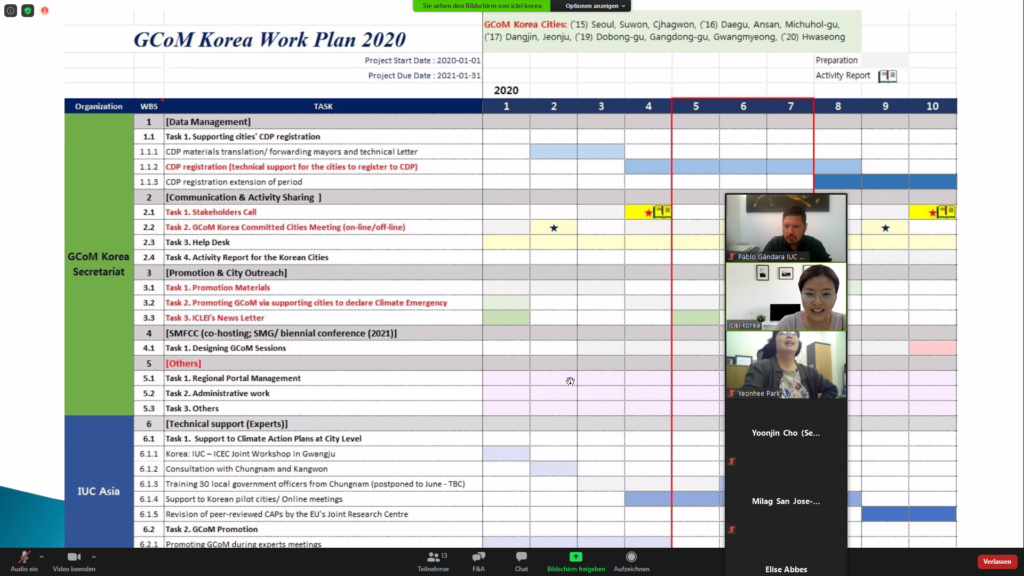 The IUC Asia project team participated today in this year’s second online stakeholders’ meeting for the Global Covenant of Mayors (GCoM) in Korea. The event was attended by 12 participants representing the country’s GCoM Secretariat, the Brussels-based GCoM Secretariat, the IUC project as well as GCoM partners from ICLEI, CDP, C40, CityNet, and the Seoul Metropolitan Government (SMG). The meeting provided an opportunity for partners to share their latest relevant activities and to align the work plan 2020. Besides, the GCoM Korea secretariat steered a discussion about the common reporting framework as a benefit for cities. Ms. Eunyoung Seo also emphasised the need to have a broad set of best practices from GCoM and CDP cities worldwide that can inspire Korean local policymakers.