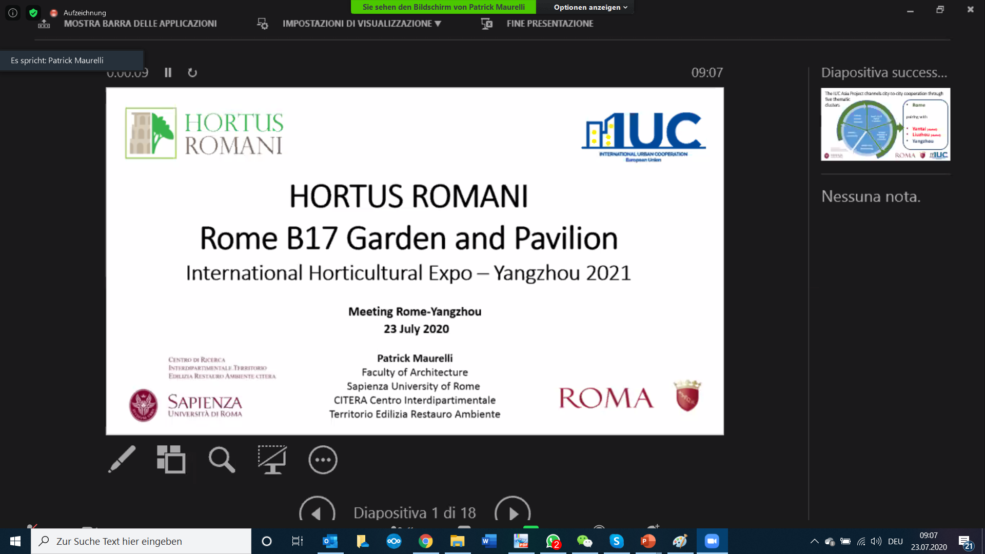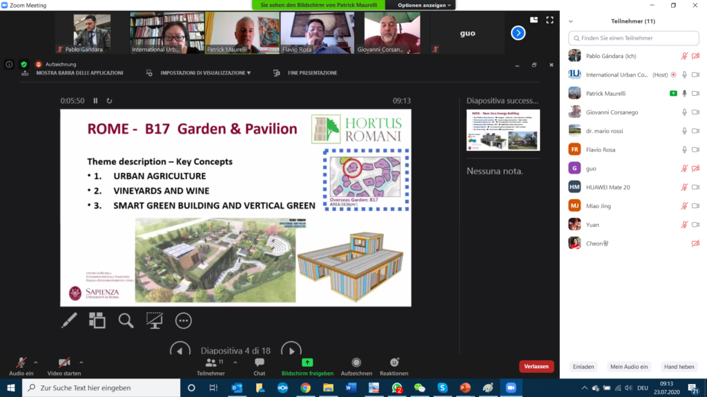 The IUC team organised an online meeting between experts from Rome and Yangzhou to discuss some technical details of Rome’s garden pavilion design as well as of few possible events to be organised by Rome during the Yangzhou Horticulture Expo 2021. Dr. Patrick Maurelli and Dr. Flavio Rossa from CITERA at Sapienza University first explained the three themes of the Rome garden: urban agriculture, vineyard & wine, and smart green building & vertical green.
