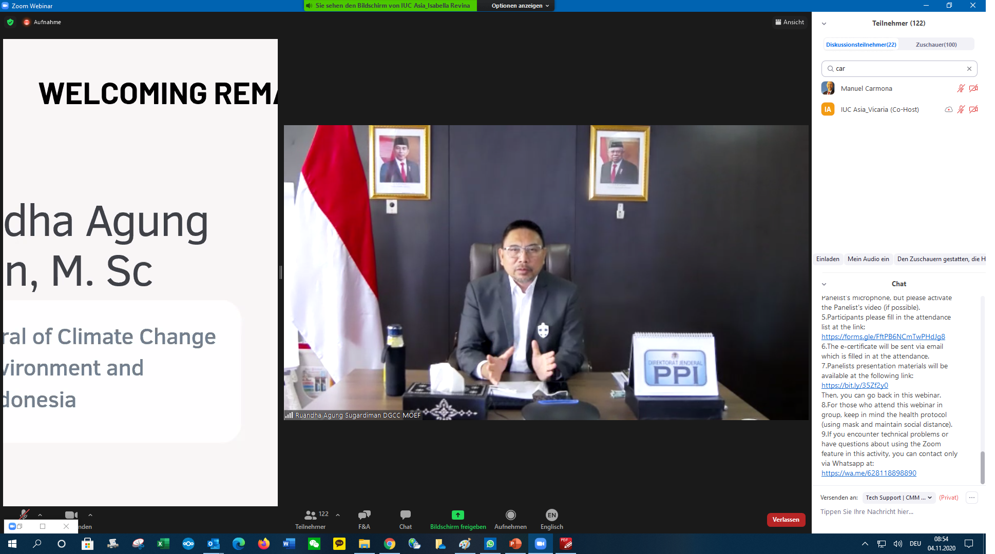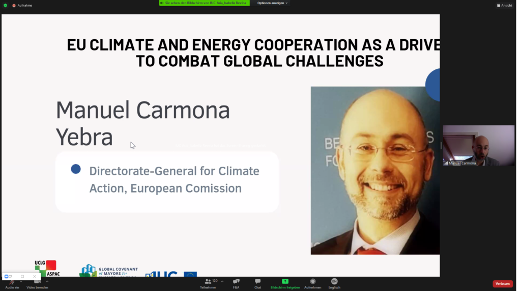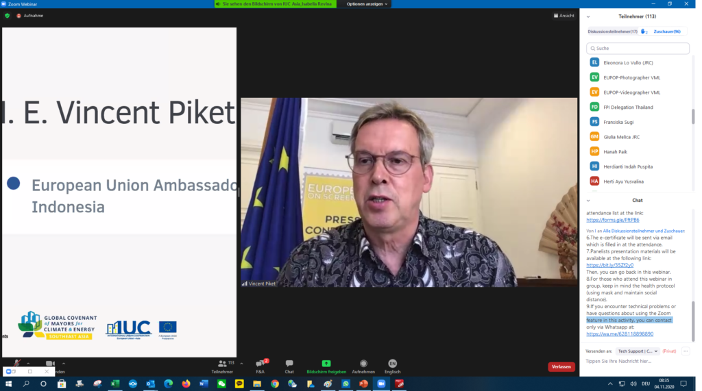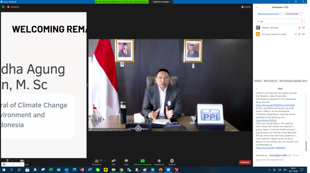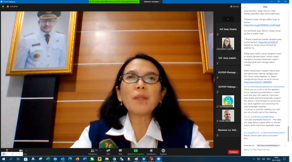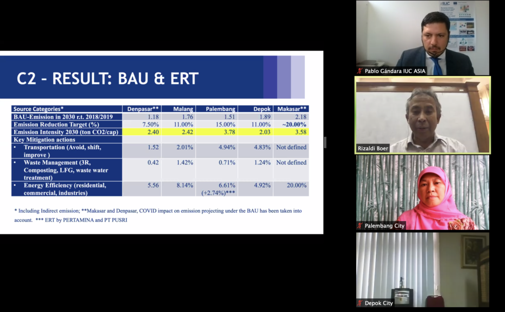 Further welcoming remarks were given by Dr. Ir. Ruandha Agung Sugardiman, Director General of the Climate Change Department at the Ministry of Environment and Forestry of Indonesia, who thanked the EU’s IUC for carrying out today’s activities in an effort to increase the capacity of greenhouse gas inventories. “This joint effort towards real action in controlling climate change….by sifting through information and exchanging experiences related to the implementation of the design of urban climate action plans, will help to provide the maximum benefit in mitigating the effects of climate change.” With regard to the COVID-19 pandemics, he added that “in this new normal era, it needs to be encouraged that each individual has a more efficient habit through the home office scheme (…). In addition, it needs to be comprehensively encouraged to lead to more environmentally friendly behaviors in the long term, including incentive mechanisms for those who have changed their behavior, especially in anticipation of waste-production due to increasing consumption”.