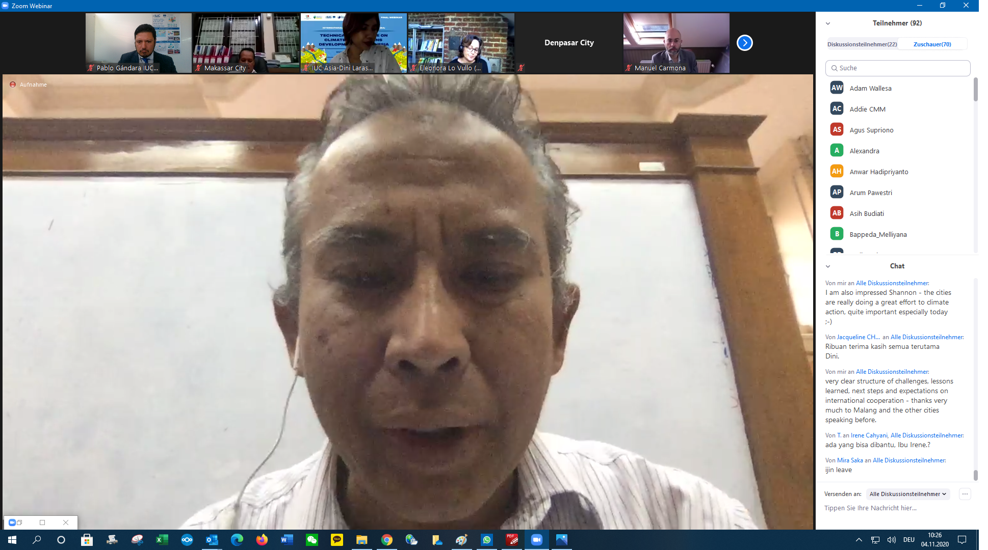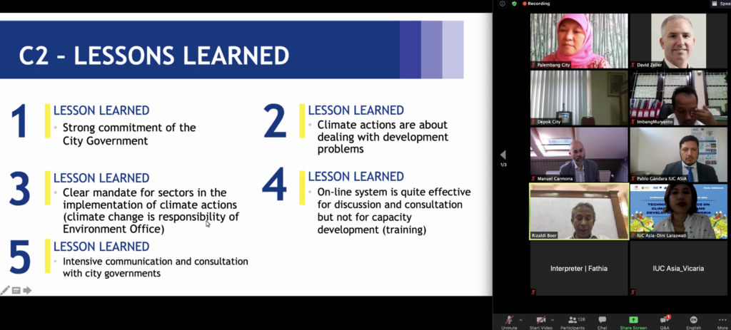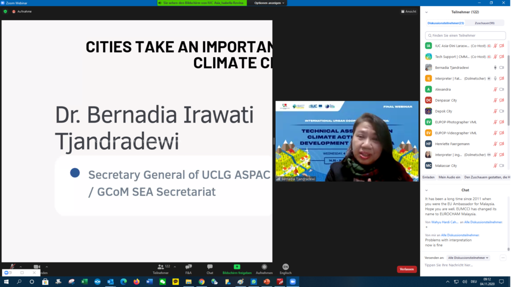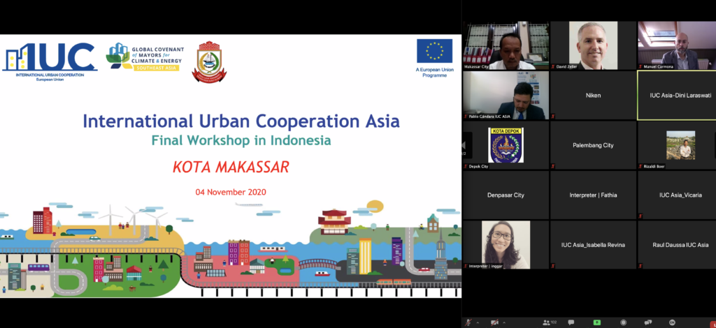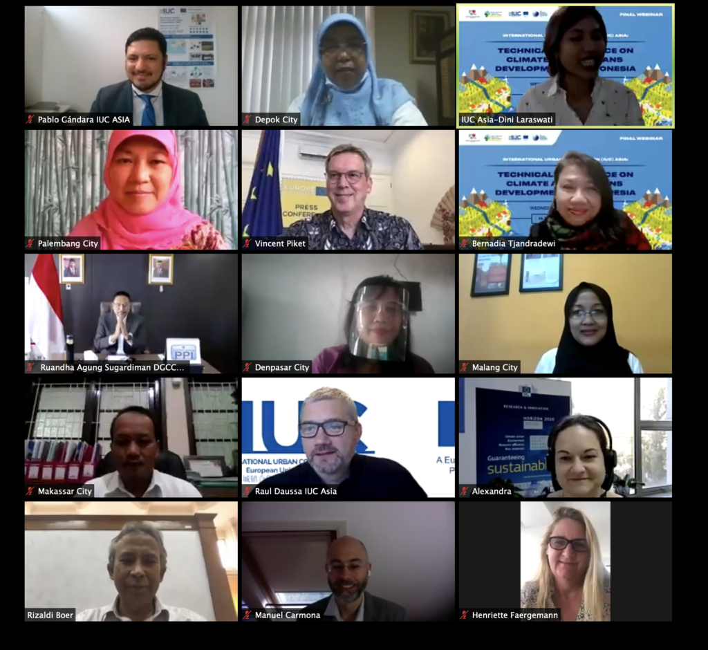 Today, the IUC Asia project held its final webinar on Technical Assistance on Climate-Action-Plans Development in Indonesia with more than 125 participants. In discussion were the so called “final products”, the Climate Action Plans and respective lessons learned during the process of developing them for the pilot cities of Palembang, Denpasar, Depok, Malang and Makassar. Also presented were the results of a mid-term monitoring webinar, reviewing emerging needs and challenges for future EU cooperation policies.