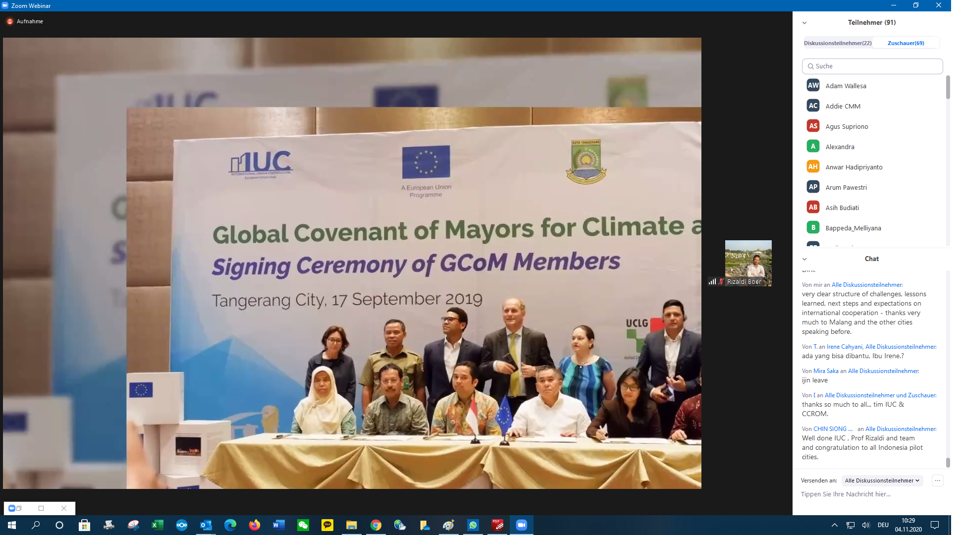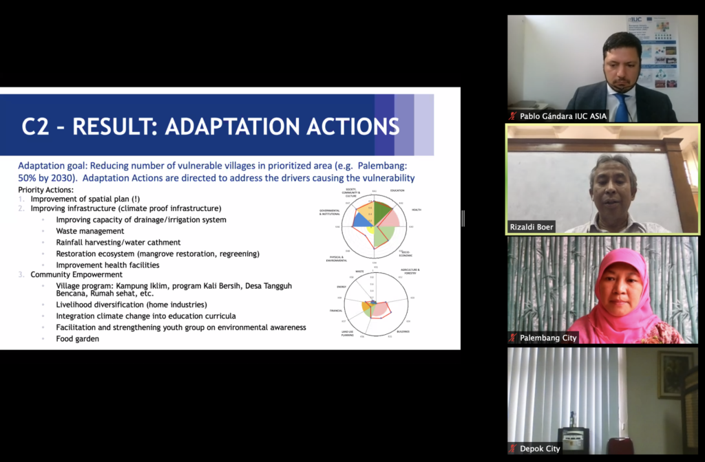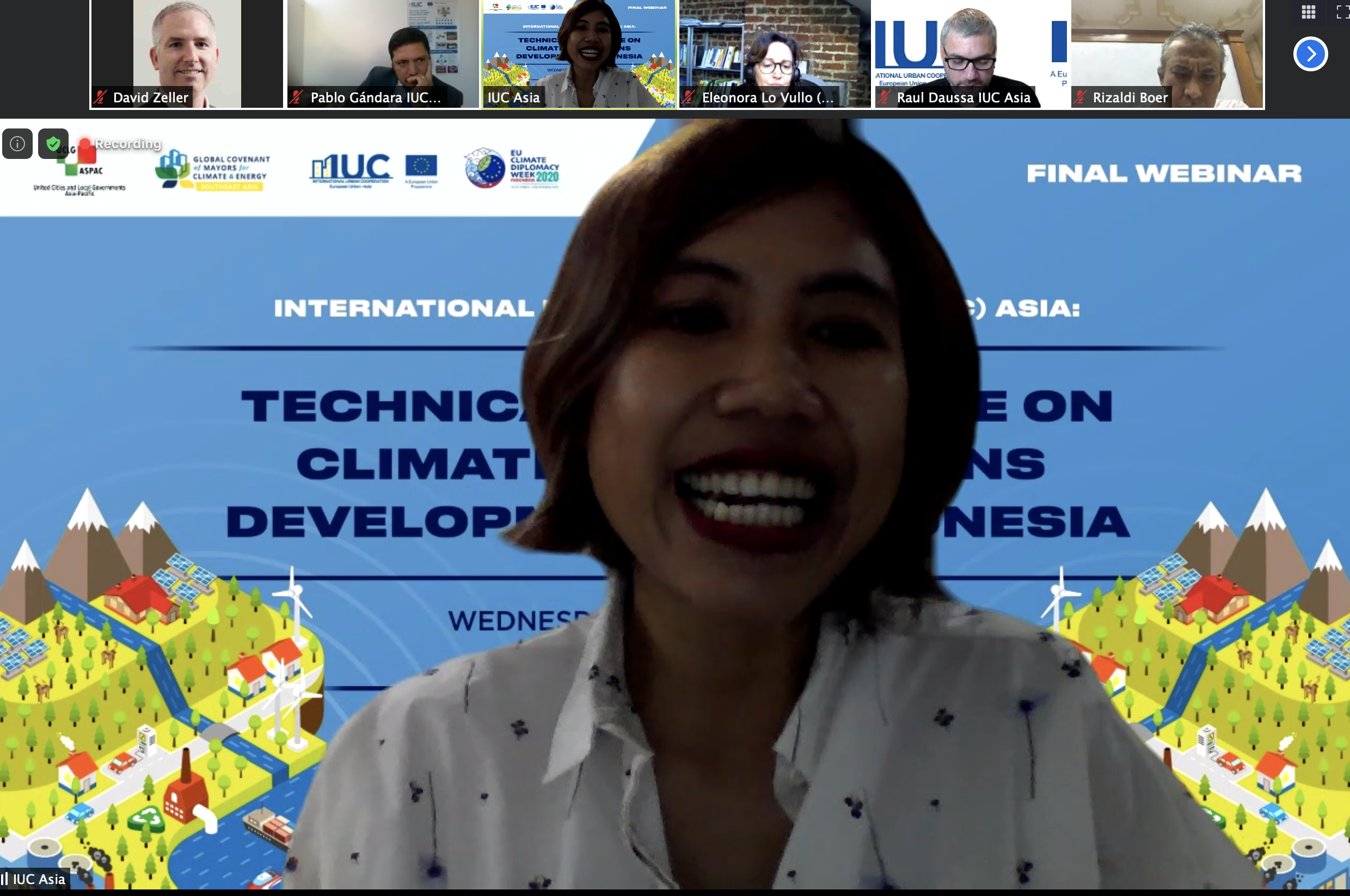 Dr. Bernadia Irawati Tjandradewi, Sec. Gen. of UCLG ASPAC (GCoM SEA Secretariat) presented the topic: Cities Take an Important Part of Tackling Climate Change and thanked the EU and the IUC partners for their effective work during the elaboration of the Climate Action Plans plans. Dr. Rizaldi Boer (CCROM) explained the climate action planning process, addressed the key results of the GHG baseline emissions inventories (BEIs) and the risk vulnerability assessments (RVAs) – both produced with EU support. He addressed few challenges including data sharing & collection, staff discontinuity in cities, the cities’ limited technical capacity for climate monitoring, limited human resources and financial for upscaling the climate actions. He also referred to the strong commitment of the Indonesian pilot city governments, the intensive communication and consultation with city stakeholders, as well as to the pros and cons of online consultations within the COVID-19 context.