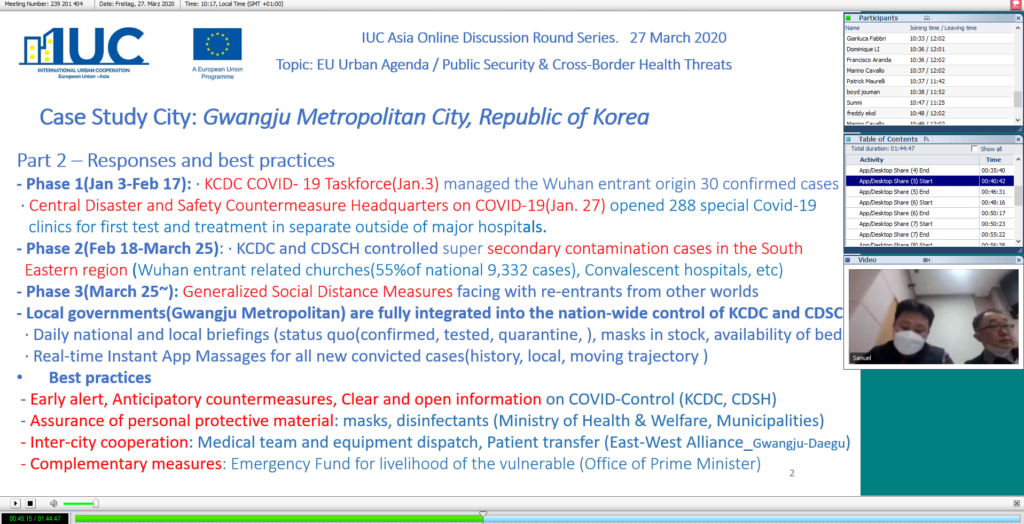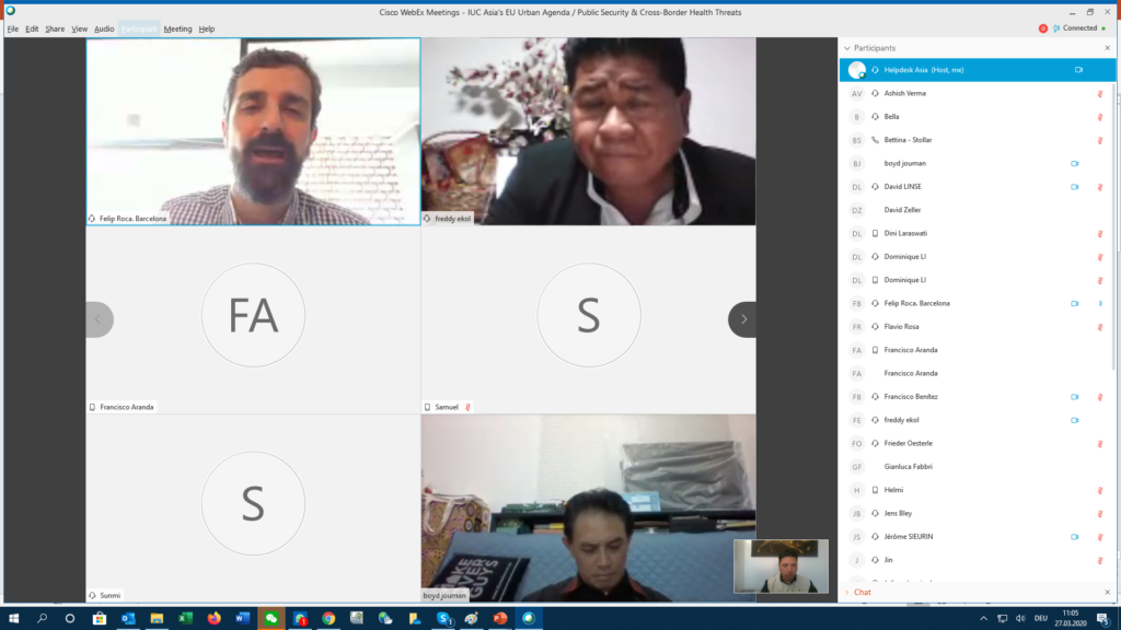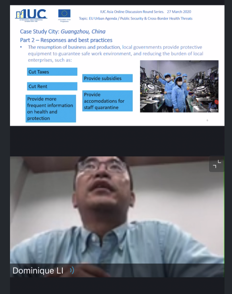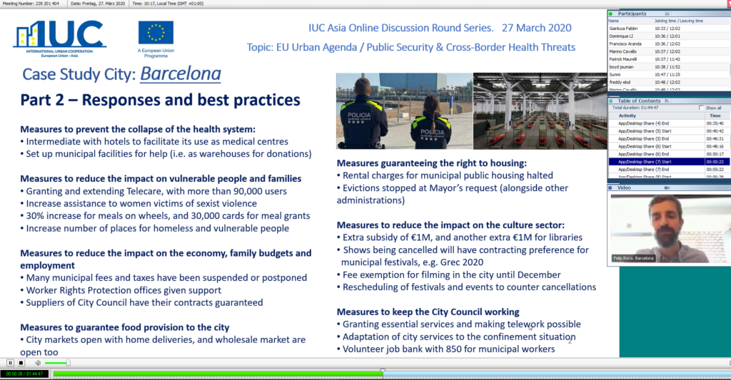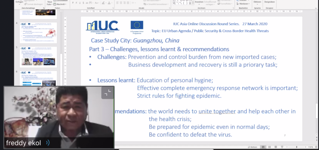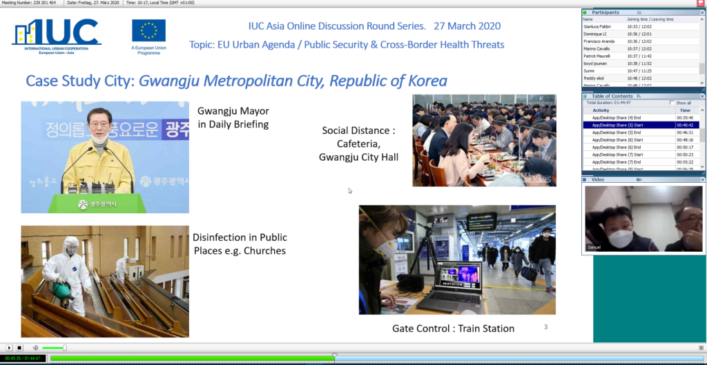 IUC-国际城镇合作项目是欧盟的一个项目,由欧洲对外行动服务(EEAS)的外交政策工具服务(FPI)管理。 IUC的亚洲区于2020年3月27日组织了一次有关国际城市合作的在线讨论,以应对当前的新冠肺炎危机。会议的目的是促进欧洲和亚洲城市之间的相互学习和帮助。共有66位专家参加了讨论,其中包括来自欧盟(欧盟委员会和欧盟议会)的参与者以及来自广州(中国)、光州(韩国)、雅加达(印度尼西亚)、巴塞罗那和格拉纳达(西班牙)、尼斯(法国)、罗马和博洛尼亚(意大利)、曼海姆和斯图加特(德国)的政府、产业、学术界代表。该活动是未来几个月将进行的一系列主题在线讨论的第一轮。