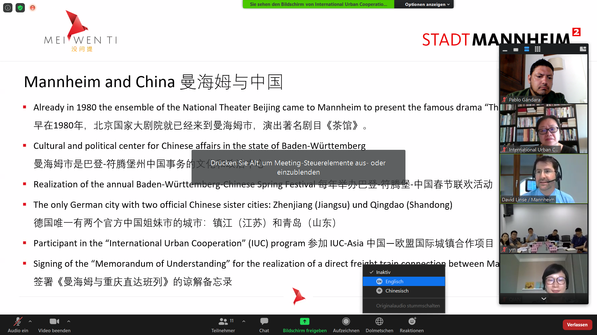 (7月15日) 今天来自重庆、曼海姆和IUC项目团队的15余名参会者在线共同讨论推进合作。IUC项目支持下,两个城市的合作从2017年的双边互访开始,在2018年中欧班列合作的基础上,逐步推向将由常设性机构支持的城市间合作。